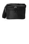 This cooler easily holds six cans as well as an ice pack and other must-haves. 420 denier honeycomb polyester, 600 denier polyester canvas Adjustable web carrying strap Heat-sealed, water-resistant lining Interior zippered mesh pocket for utensils Large front slip pocket for easy decoration access Dimensions: 6.25'h x 9'w x 7'd; Approx. 393 cubic inches Note: Bags not intended for use by children 12 and under. Includes a California Prop 65 and social responsibility hangtag .